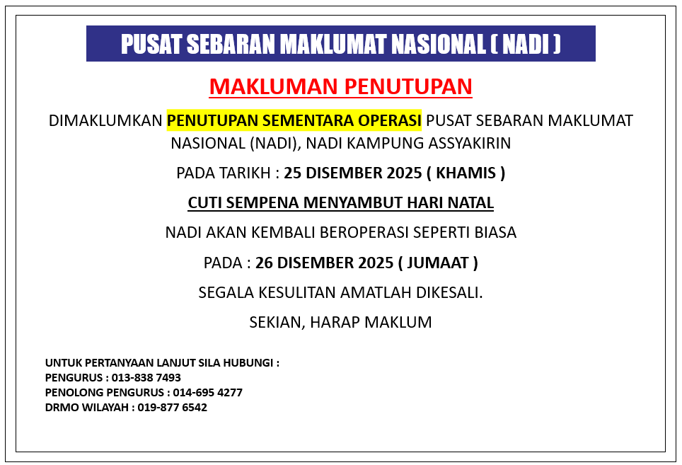 ๐๐๐๐๐๐๐ ๐๐๐๐ ๐๐๐๐๐๐๐ @ ๐๐๐๐ ๐๐ข๐๐ฏ๐๐ง๐ญ๐ฎ๐ซ๐: ๐๐ฎ๐ญ๐ข ๐๐๐ค๐จ๐ฅ๐๐ก ๐๐ข๐ฃ๐๐ค & ๐๐ซ๐จ๐๐ฎ๐ค๐ญ๐ข๐ Tarikh: 22 Disember 2025 / Isnin Masa: 10.00 pagi โ 11.00 pagi Tempat: NADI โฆ