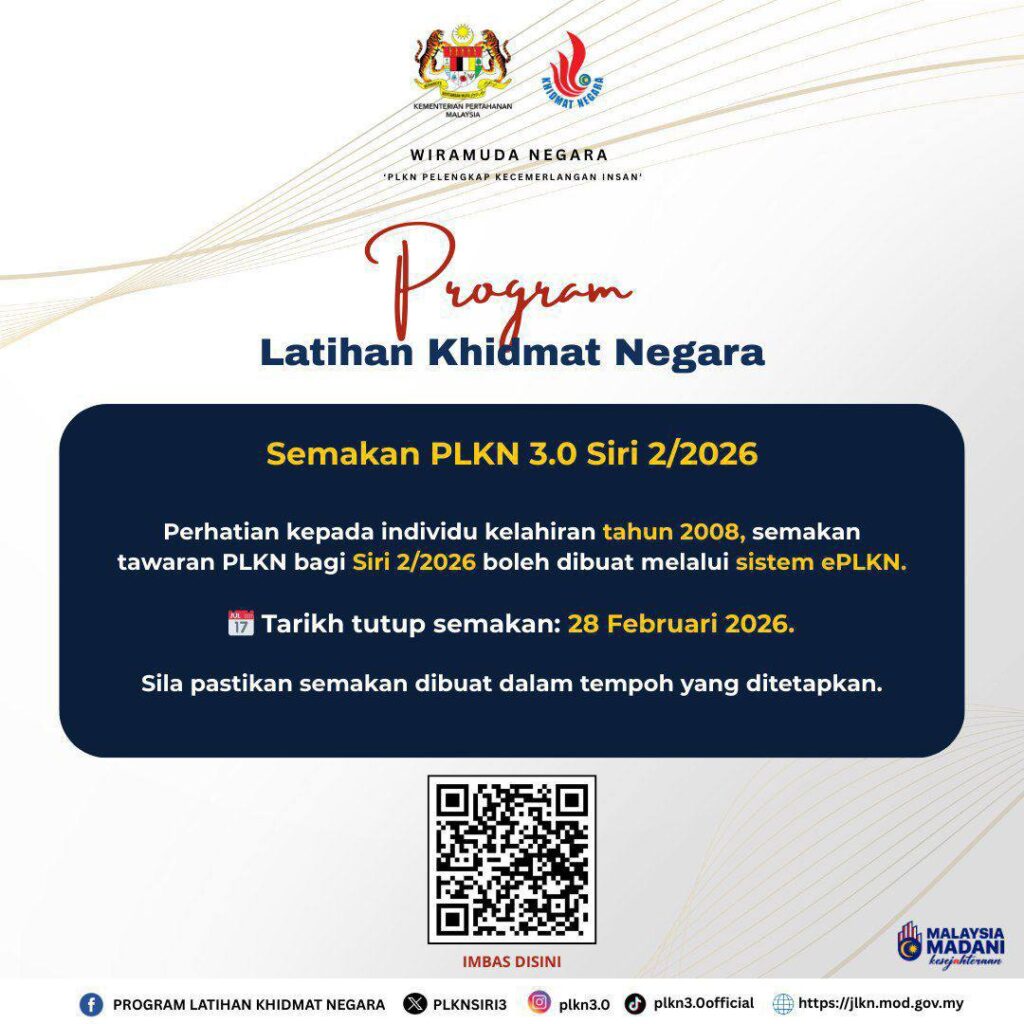 Semakan kepada bakal pelatih (SIRI 2/2026) bagi daftar KELAHIRAN TAHUN 2008 boleh dilakukan bermula hari ini melalui Sistem ePLKN 3.0 seperti ketetapan berikut: TARIKH SEMAKAN: โฆ