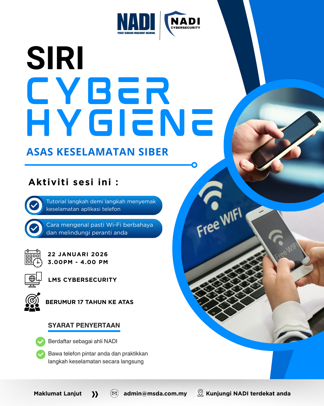 22 Januari 2026 3.00 PM – 4.00 PM NADI Kampung Assyakirin 17 tahun ke atas Apa yang anda akan belajar: Semak keselamatan aplikasi telefon Kenal pasti Wi-Fi berbahaya dan melindungi […]