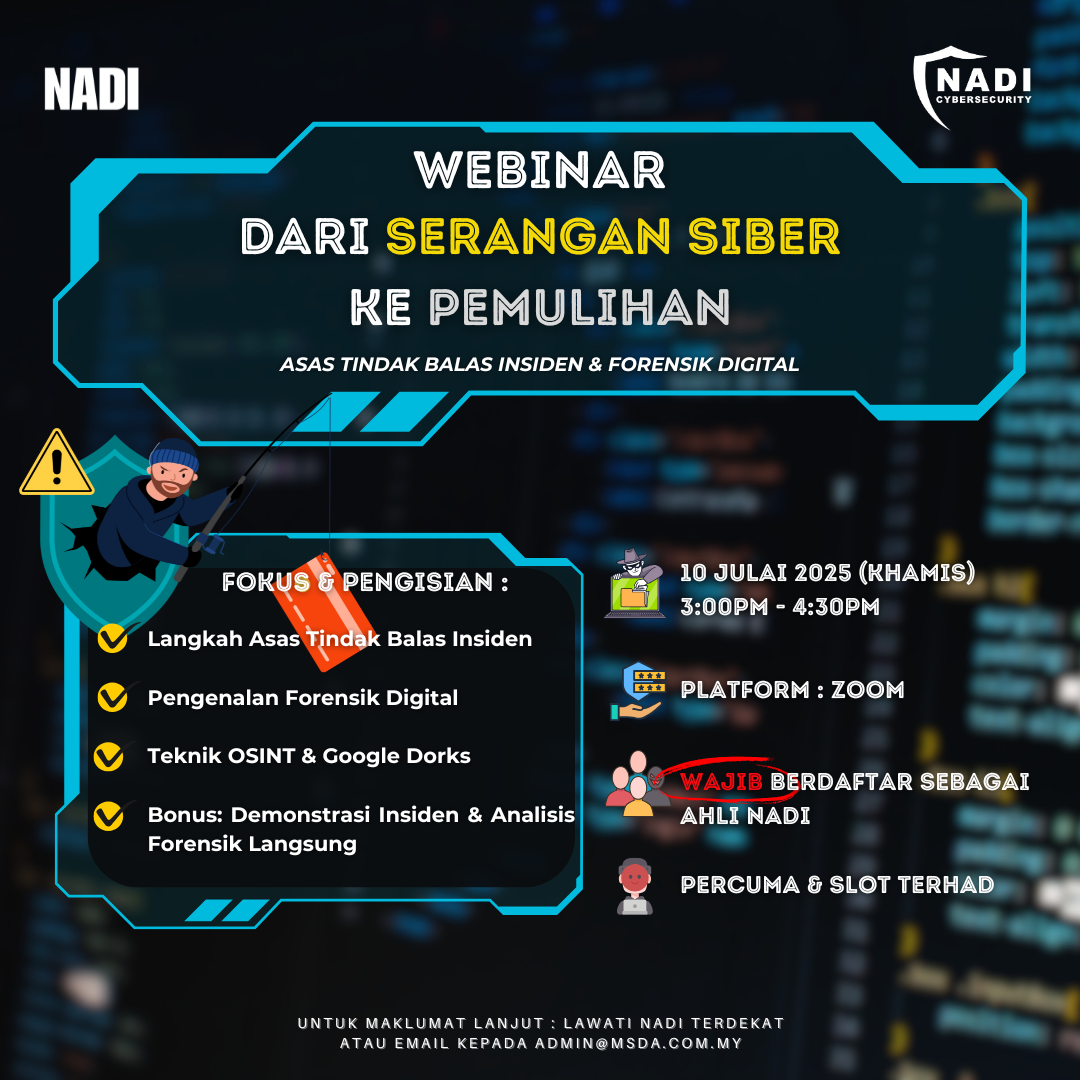 DARI SERANGAN SIBER KE PEMULIHAN Asas Tindak Balas Insiden & Forensik Digital 10 Julai 2025 (Khamis) 3:00 PM โ 4:30 PM Platform: Zoom Tempat : NADI Kampung Assyakirin Apa yang […]