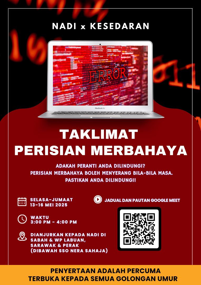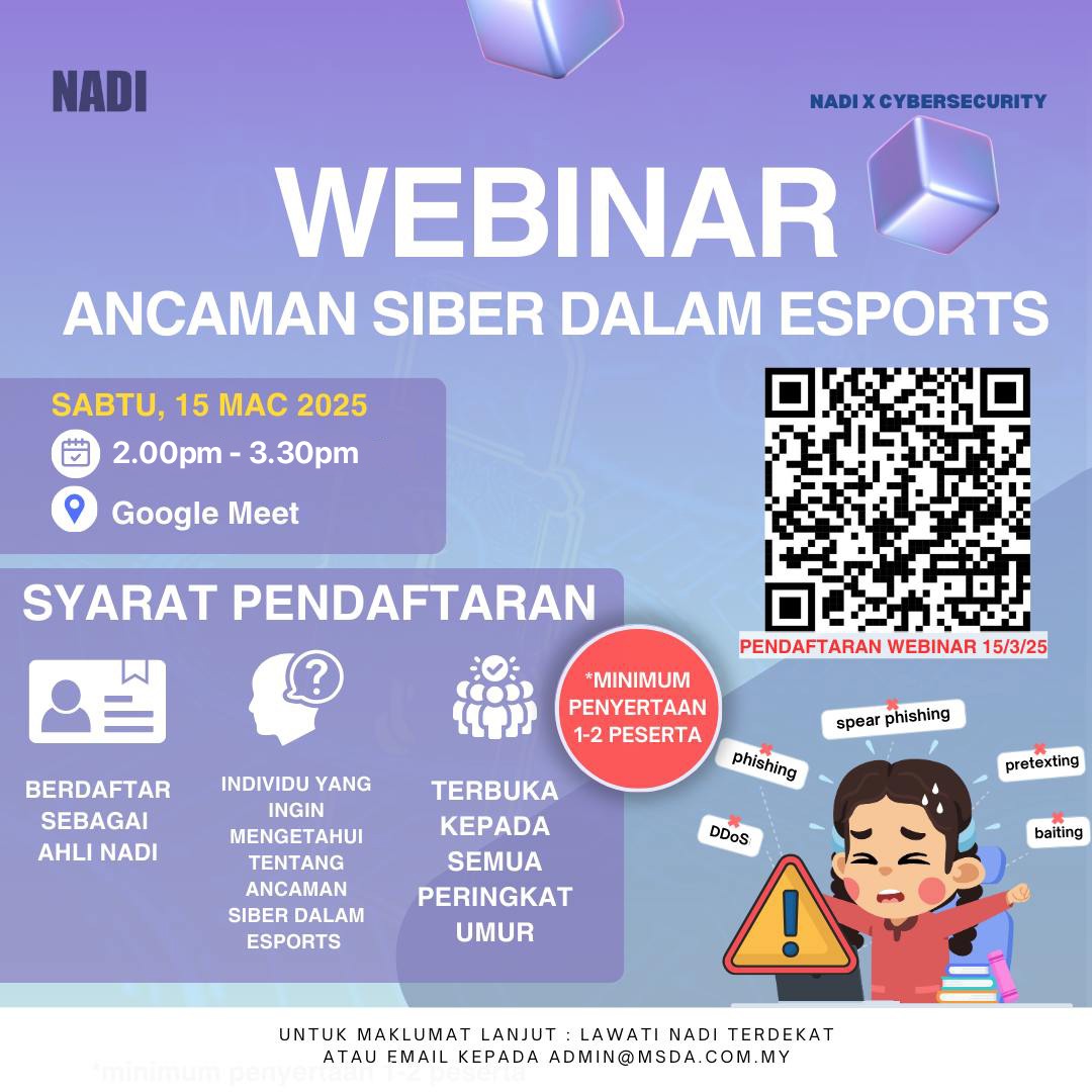 ๐ฎ Webinar : Ancaman Siber dalam eSportsโฐ 15 Mac 2025 (Sabtu) *2.00 โ 3.30 petang๐จ๐ปโ๐ฆฐ๐ฉ๐ป Terbuka kepada semua peringkat umur .๐ง๐ปโ๐ป Google Meet: https://meet.google.com/dsy-hktd-ifd Tempat : NADI Kampung Assyakirin