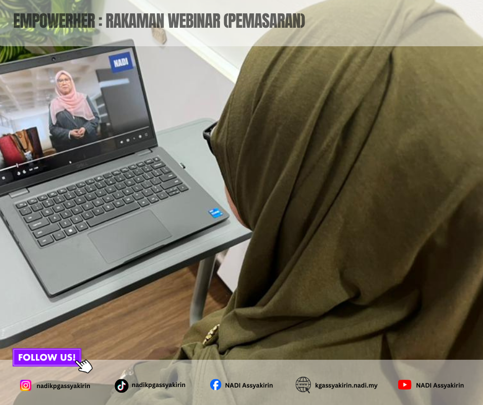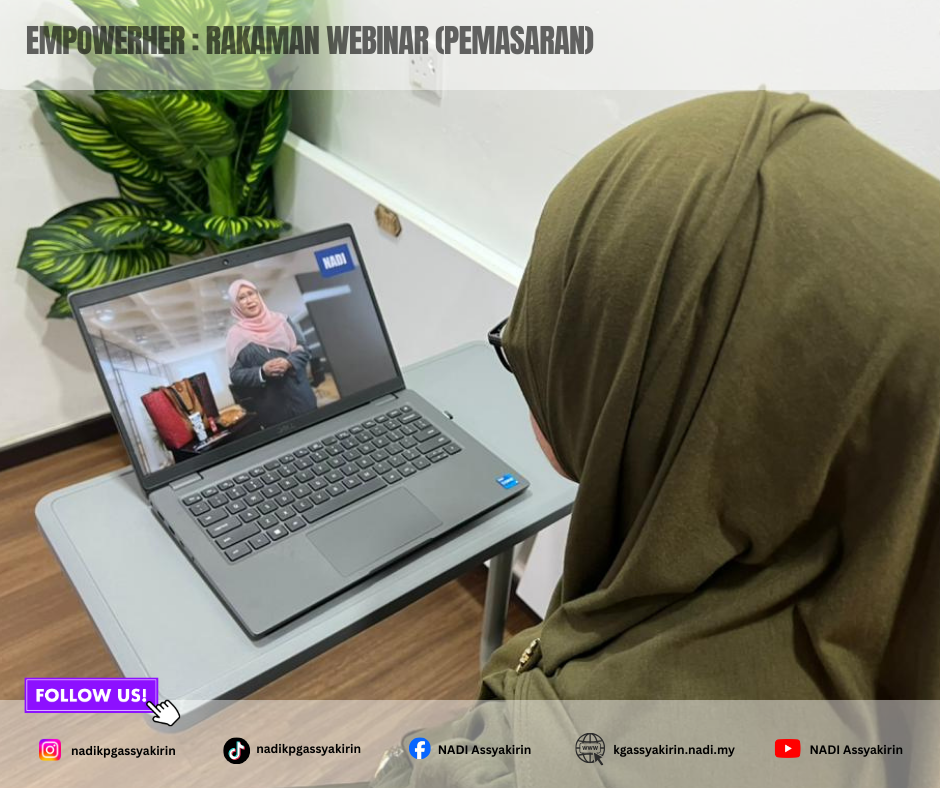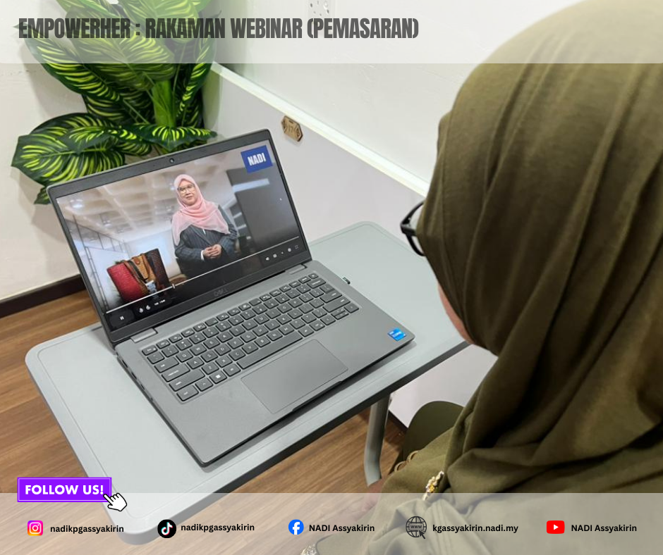 EMPOWERHER Rakaman Webinar (Pemasaran) merupakan medium pembelajaran berterusan yang menyediakan akses fleksibel kepada peserta untuk memahami ilmu dan strategi pemasaran digital melalui sesi webinar yang dirakam. Rakaman ini merangkumi perkongsian berkaitan asas pemasaran, penjenamaan perniagaan, teknik promosi serta penggunaan platform digital yang berkesan, khususnya bagi wanita usahawan. Inisiatif ini membolehkan peserta mengulang tontonan mengikut kesesuaian masa, sekali gus membantu meningkatkan kefahaman, kemahiran dan keyakinan dalam mengaplikasikan strategi pemasaran bagi memperkasa perniagaan masing-masing.